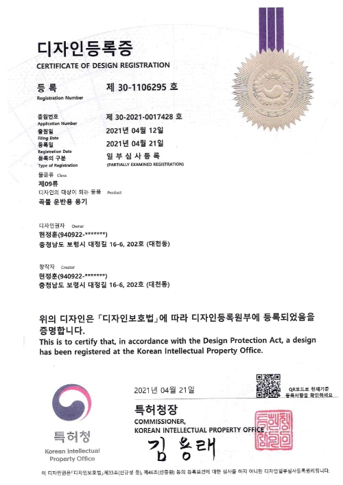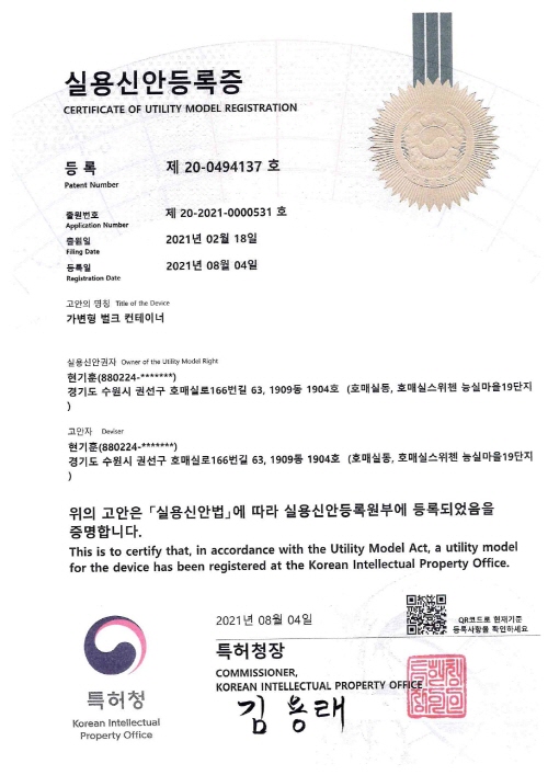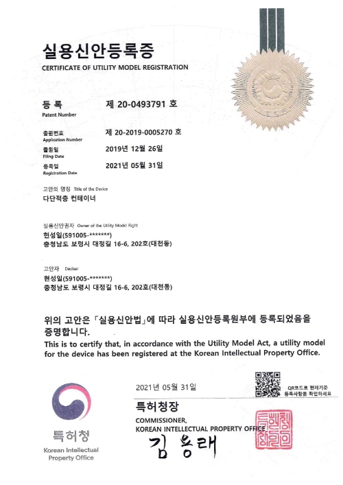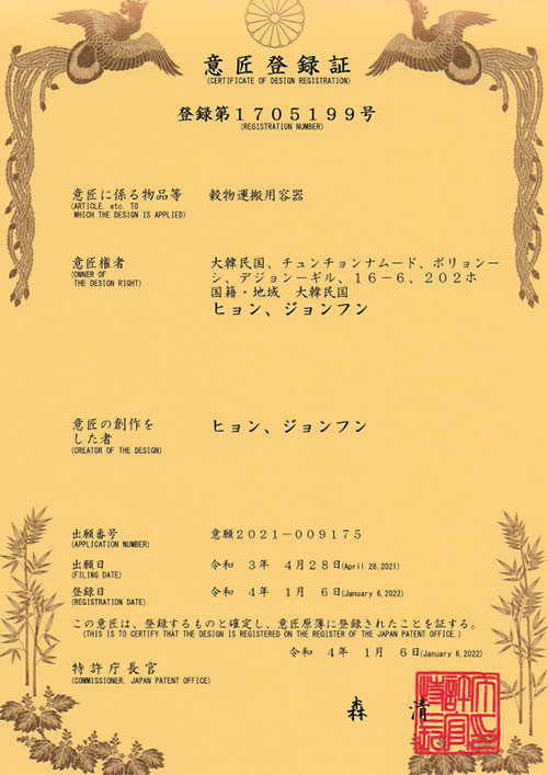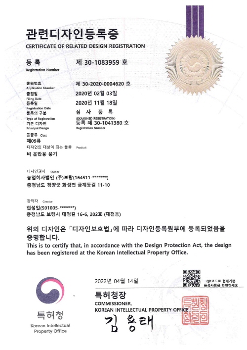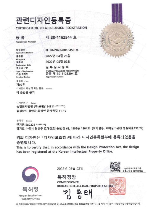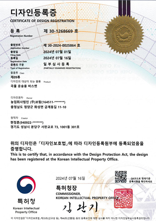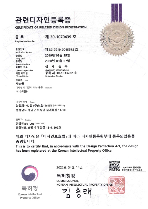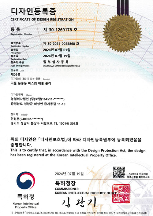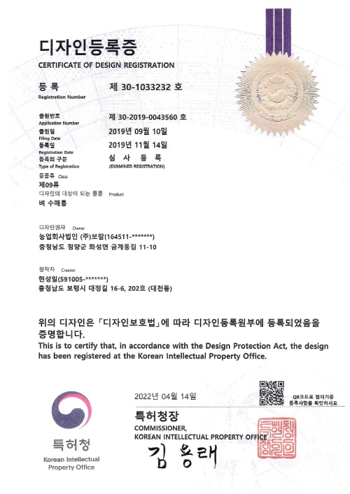 벼수매통 전문 제작사 (주)보람은 다수의 벼수매통 및 곡물적재함에 대한 특허를 보유하고 있으며, 특히 위와 같은 형태의 지게차를 이용하여 2~3톤의 곡물을 담고 회전시킬 수 있도록 특정 위치를 관통하고 있는 용기에 대한 원천특허를 보유 중입니다.